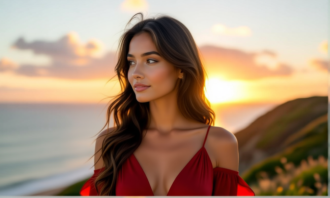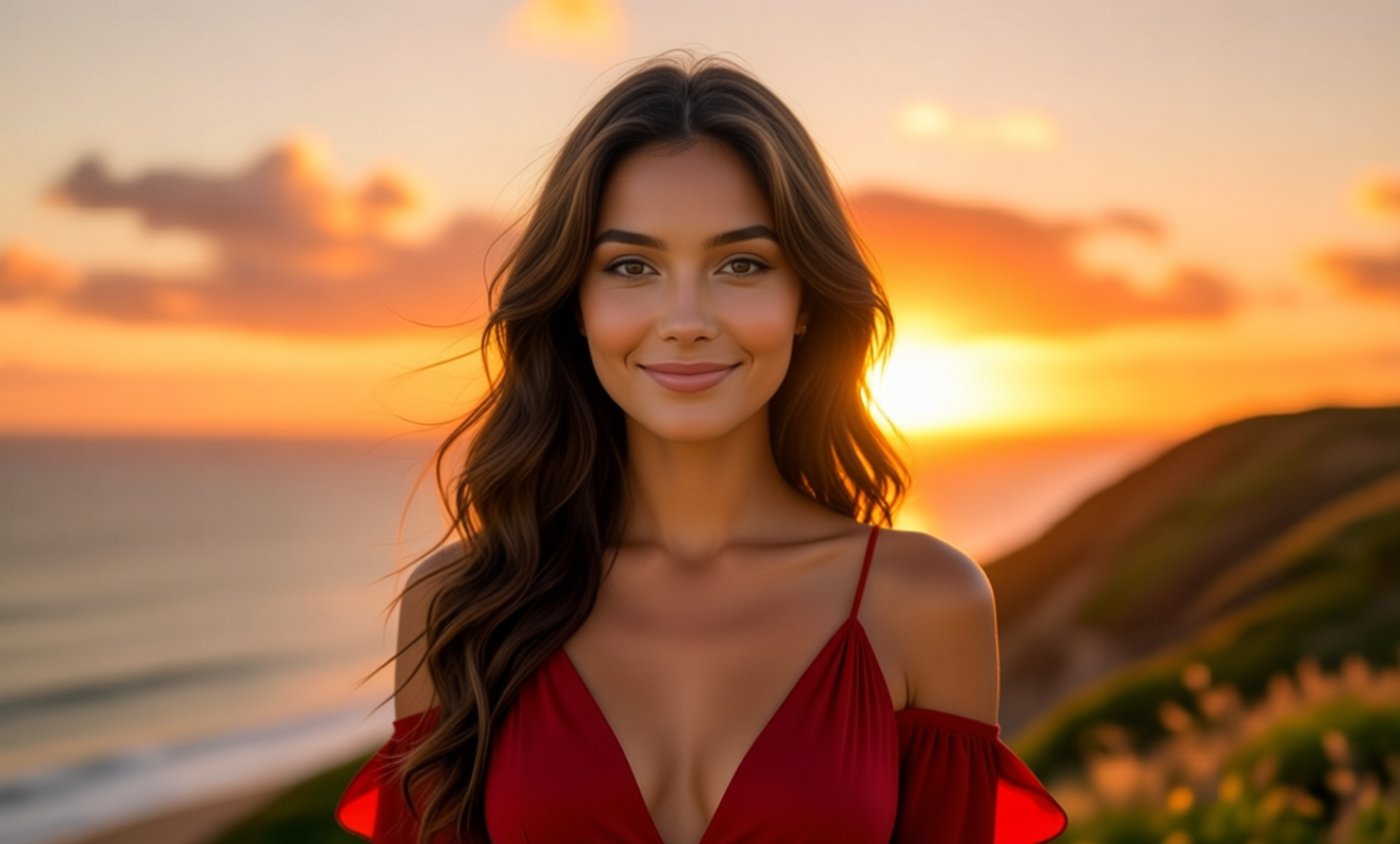 A woman in a red dress on a coastal cliff at sunset. She faces the camera and speaks directly to the viewer. Her lips move as she says: "The old gods are silent. But I am not. I have walked through fire and shadow, and I am still here." Solo shot, one person. Wind in her hair. Golden hour lighting.